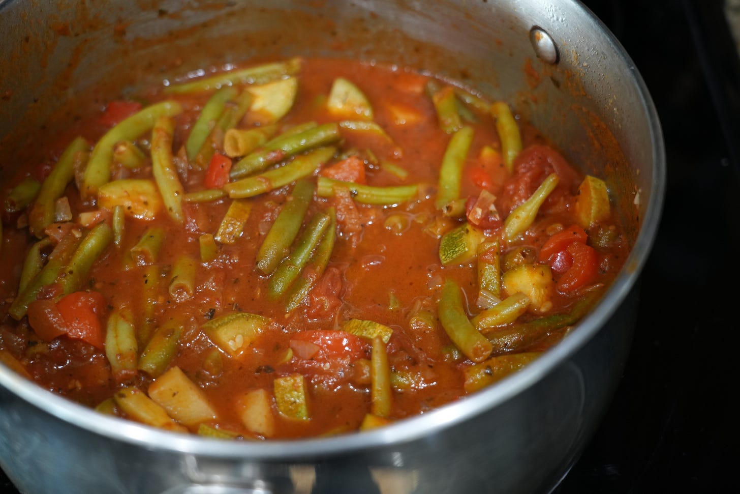 Bring to a boil, stirring occasionally, then reduce to low heat and allow the covered pot to simmer for 35-45 minutes, stirring occasionally. The fasolakia is ready when the potatoes are cooked through.